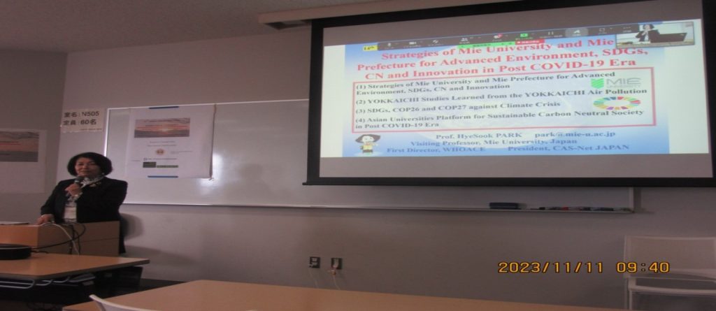 朴 恵淑「三重GPN」代表幹事(会長)は、英語による歓迎スピーチの後、基調講演の「ポストコロナ時代における環境先進大学としての三重大学と三重県の戦略的取組(Strategies of Mie University and Mie Prefecture for Advanced Environment, SDGs, CN and Innovation in the Post COVID-19 Era)」を行いました。日本の高度経済成長を支えながら、四日市コンビナートからの大気汚染によって、1960〜70年代の日本の4大公害の四日市公害(ぜんそく)による甚大な被害を受けた四日市公害の過去の教訓を生かし、現在を知り、未来の正の遺産と変える「四日市学」について説明を行い、気候危機への国際的動向について、国連気候変動枠組条約締約国会議のCOP21、COP26、COP27への参加経験に基づく国際議論と合意について語り、ポストコロナ時代における持続可能な循環型・脱炭素(カーボンニュートラル)社会創生のため、アジアの大学間プラットフォーム構築・運営について提案を行ないました。