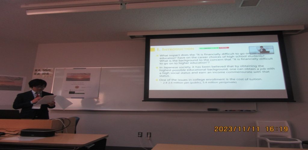 小西 凌「三重GPN」事務局メンバーは、「経済的に進学が困難と考える高校生の学習時間に関する研究―ポストコロナ時代への示唆 (A Study on Learning Time of High School Studies Who Think “Going to Higher Education in Financially Difficult”- Implications for POSTCOVID-19)」について研究発表を行ないました。アンケート調査に基づく経済格差と高校生の学習時間には正の相関が見られ、大学進学において親の経済力が影響を及ぼすことを統計データで示し、今後の研究への高く期待が持たれました。