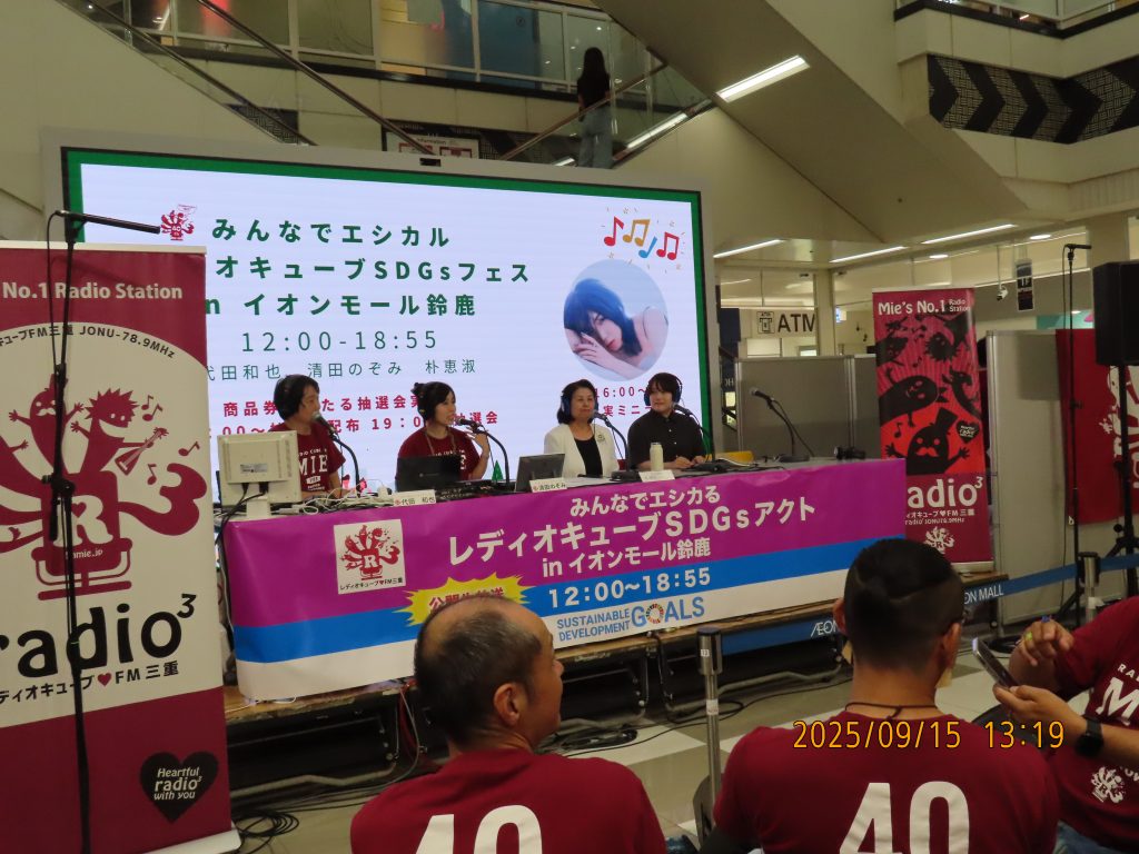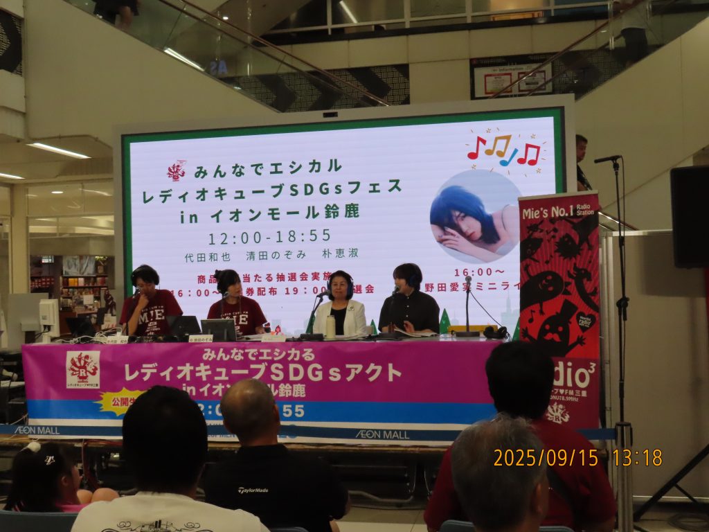 2025年9月15日の午後1時から7時までに、イオンモールモール鈴鹿で開催された『「FM三重」みんなでエジカルレディオキューブSDGsアクトin イオンモール鈴鹿』に、朴 恵淑三重大学地域イノベーション学研究科客員教授・「三重GPN」代表幹事(会長)は、FM三重の代田和也アナウンサーと清田のぞみアナウンサーと共に昨年に続き、パーソナリティをつとめました。