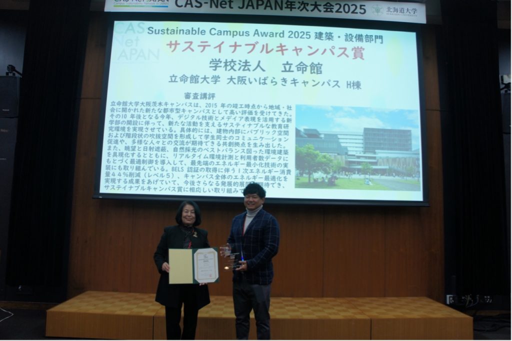 建築・設備部門のSC賞は、立命館大学の「立命館大学大阪いばらきキャンパスH棟」の取り組みが受賞されました。「まぜるキャンパスからまぜて、生み出すキャンパスへ」を基に、キャンパスを学舎としてだけでなく、学外のステークホルダーとの共創の起点となる空間づくりを通じて、さらなる社会解題を解決するイノベーション創出を目指していることが高く評価されました。奨励賞は、千葉大学/(株)佐藤総合計画/丘の上事務所/(株)dpランドスケープ/(株)テクノ工営の「千葉大学工学・情報楽経講義棟」の取り組みが受賞されました。「キャンパスコモンの連鎖による居場所と環境の形成」を基に、大学と企業との連携による、既存の建物と新講義棟の再編計画であり、グリーンインフラ・アーキテクチャーを実現していることが高く評価されました。
