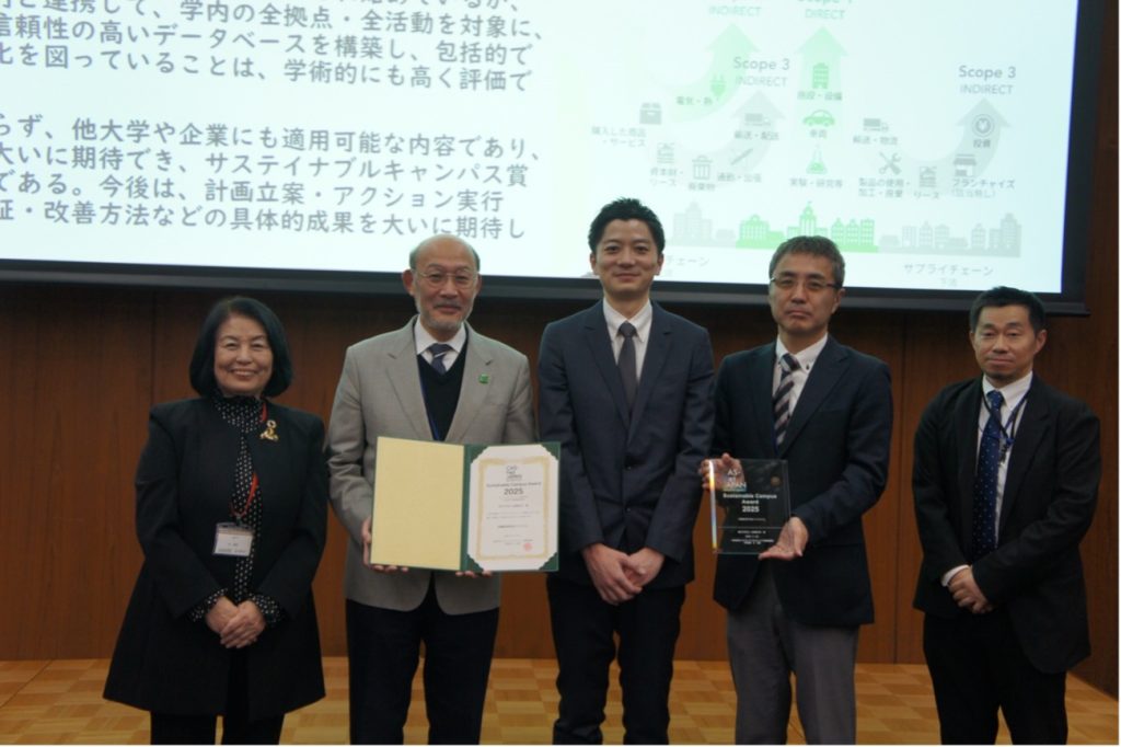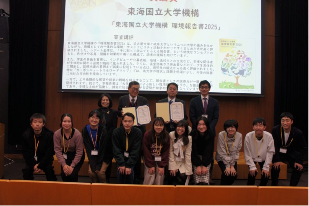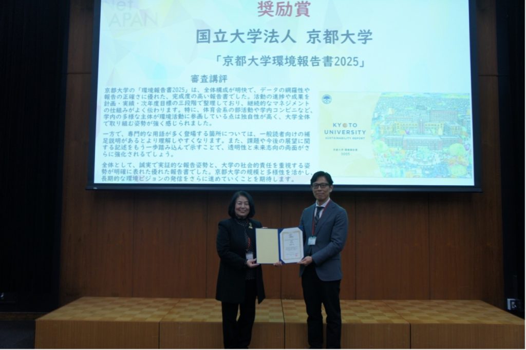 サステイナビリティレポート・アワード(SRA)の奨励賞は、「東海国立大学機構環境報告書2025」および「京都大学環境報告書2025」が表彰されました。「東海国立大学機構環境報告書2025」は、名古屋大学と岐阜大学それぞれの特色を生かしながら、機構全体としての取組を一体的にまとめた点が高く評価されました。教育・研究・地域連携の内容が分かりやすく整理されており、CO₂排出量などのデータを具体的に開示し、目標未達の要因などの説明責任を果たしており、学生のインタビューや表紙デザインの公募など、多様な主体を巻き込む工夫にも創意が感じられる環境報告書として高く評価されました。「京都大学環境報告書2025」は、計画・実績・次年度目標を体系的にまとめた、わかりやすさや実証的な報告が高く評価されました。体育会系の部活動や学内コンビニなど、大学内の多様な主体が環境活動に取り組む内容など、大学全体で環境に向き合う姿勢が伝わり、データの網羅性や整理の丁寧さ、社会との連携など、京都大学の強みと多様性を生かした報告書として高く評価されました。