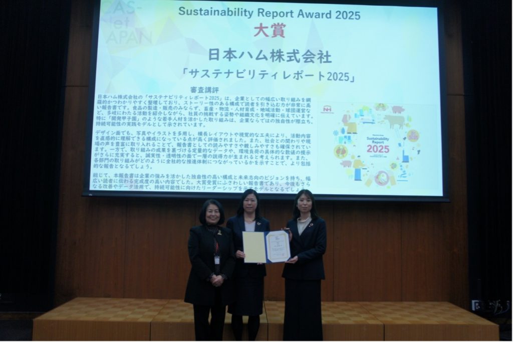 サステイナビリティレポート・アワード(SRA)の大賞は、日本ハム(株)の「サステイナビリティレポート2025」が表彰されました。食を軸に、研究開発・畜産・人材育成・地域貢献など、事業全体を通じて社会とのつながりなどが高く評価されました。食べる喜びという一貫したテーマのもと、社員が主体的に挑戦する企業文化、未来に向けたロードマップを明確に示しており、多様な活動を統合し、未来志向のストーリーとして描いた本レポートは、企業のサステナビリティの模範と言える内容として高く評価されました。