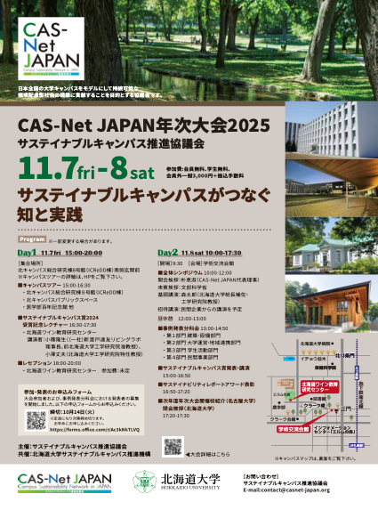2025年11月7(金)−8(土)に、「第13回サステイナブルキャンパス推進協議会(CAS-Net JAPAN)2025年次大会」が北海道大学で開催され、朴 恵淑三重大学地域イノベーション学研究科客員教授/名誉教授・三重GPN代表幹事・東洋紡楠リノベーションセンター(TRC)顧問がCAS-Net JAPANの代表理事(会長)として参加しました。