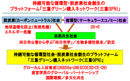 「三重グリーン購入ネットワーク(三重GPN)」は、ヒト・モノ・情報が常に循環していく認識共同体としての役割を担うプラットフォームとしての役割を担い、互いの上昇効果を図ることで、1+1は単なる2はなく、100とも、1億ともなる戦略的拠点を目指しています。